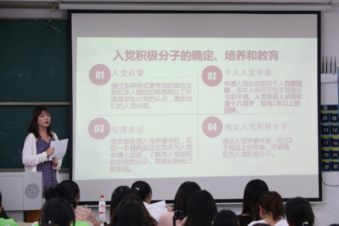 粮工学院为了让2019级新生正确看待入党问题,树立正确的入党动机,详细了解入党程序,争取做合格党员,9月26日下午在4-311举行了新生入党介绍会。先学生党支部副书记结合发展学生党员的规定,从入党动机、入党条件、入党要求、入党程序和注意事项等方面为新生做了全面的介绍。再是辅导员郭雅纯介绍了大学生入党现状,指出大学生入党过程中容易出现的问题和误区,讲解了大学生应有正确的入党动机并鼓励大家积极向党组织靠拢,加入中国共产党,服务人民,报效国家,到场同学们都表现出了积极地入党热情。