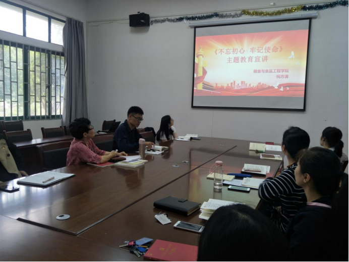 在全党开展“不忘初心、牢记使命”主题教育,是以习近平同志为核心的党中央统揽伟大斗争、伟大工程、伟大事业、伟大梦想做出的重大部署。根据中共中央和省委部署要求,按照学院党委《beat365亚洲版官网知行学院“不忘初心、牢记使命”主题教育实施方案》,粮工学院党总支10月10日在知化楼101开展了“不忘初心、牢记使命”主题教育动员会,全体党员参会。