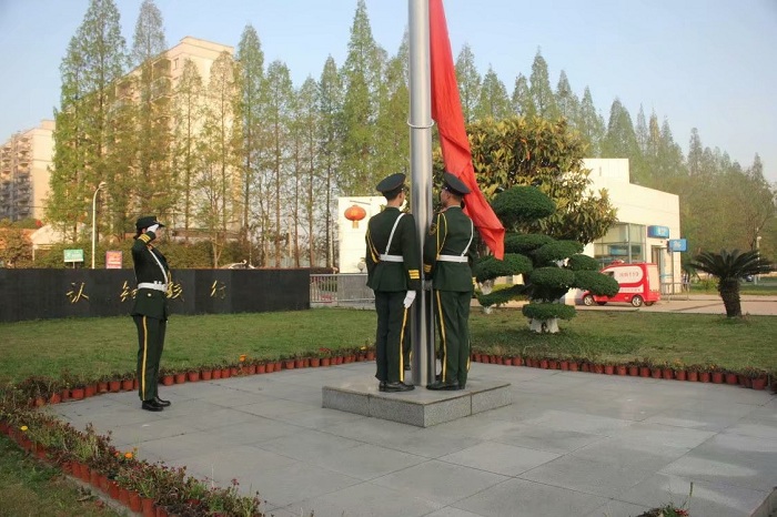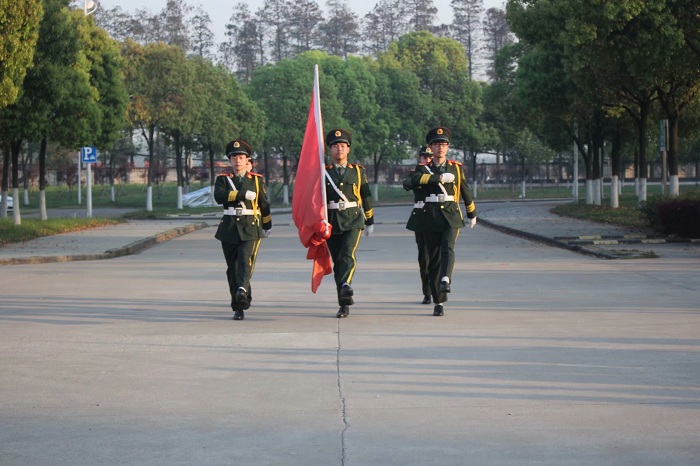 7时整,旭日初升,升旗仪式正式开始,在英姿飒爽的院国旗班国旗护卫队队员护卫下,伴随着雄壮激昂的《义勇军进行曲》,鲜艳的五星红旗冉冉升起,全体学生面向国旗庄严肃立,高唱国歌。