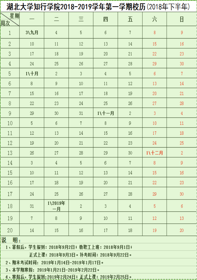 beat365亚洲版官网知行学院2018-2019学年第一学期校历
