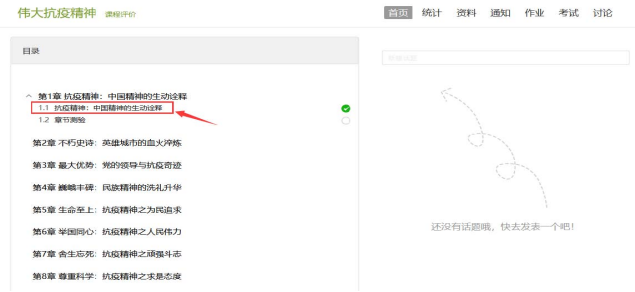 1.完成视频和测验任务点。进入课程页面,可以在【章节】看到课程内容,单击章节目录进入,便可完成视频学习和章节测验。