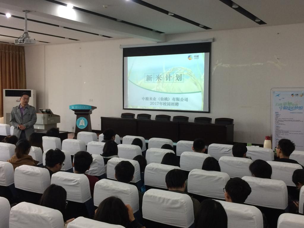 宣讲会上人事部童经理首先介绍了中粮集团和中粮米业的简介,随后介绍了中粮米业(仙桃)有限公司,中粮米业(仙桃)有限公司是中粮集团在湖北省全额投资新建的集稻谷种植、大米及相关副产品加工、科研、贸易以及仓储物流于一体的大型粮食现代化企业,是湖北省单体产能最大、自动化程度最高的粮食加工企业,属国家农业产业化政策所支持的项目范畴。占地240亩,总投资3.98亿元,现有正式职工90余人,辅助工近200人。该公司位于仙桃市高新技术产业园,生产福临门、五湖、东海明珠、荆楚香等系列产品,有强大的仓储能力,先进的加工检验设备,严格的质量管控体系,合作单位多,市场表现好。然后童经理表明了此次校园宣讲,主要是介绍仙桃米业“新米计划”,为企业招贤纳士,希望同学们积极填写应聘表并参与面试。接着,经理助理就公司的办公环境、食宿情况、薪资福利等方面的情况跟学生进行了互动。最后,有意向前往该公司的同学填写了应聘登记表并留下来面试。