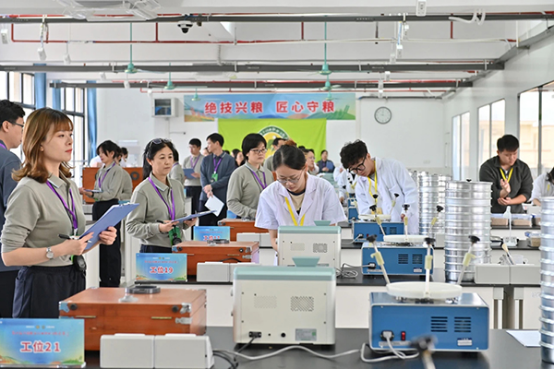竞赛以“技能成才,为国保粮”为主题,共有全国30个省(区、市)粮食和物资储备局及4家涉粮央企的34支代表队、322名选手参加,参赛选手人数再创新高。共设有(粮油)仓储管理员和农产品食品检验员2个职业,选手们分别进行储粮通风机配置合理性评价与通风条件判断、佩戴正压式空气呼吸器检查气调储粮杀虫效果、计算机粮情检测与分析、感官鉴定及试样称量、稻谷脂肪酸值的测定、粮食验质定等、粮食中真菌毒素的液相色谱法定量分析等7个赛项的实操比拼。赛事启动以来,beat365参赛选手在专业老师的悉心指导下,认真进行理论测试和技能操作的培训和演练,不断提高自己的技能水平,最终在决赛中脱颖而出,为湖北省粮食局和学校争得了荣誉。beat365亚洲版官网刘齐、汪浩明两位老师受大赛邀请担任了竞赛裁判工作。